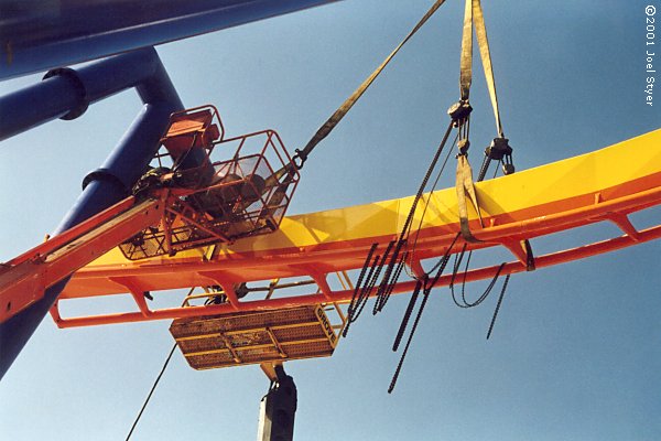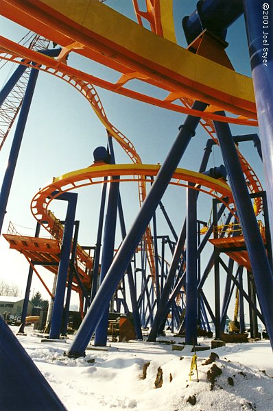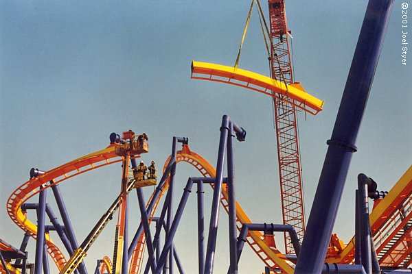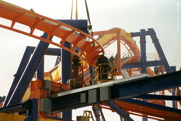 As you view these photos, look closely at the spacing for the train. It will provide an amazing effect to the rider. We will start off with a couple shots of the first drop, loop and Zero G Roll and move quickly into the Immelmann, Inclined Spiral and S-Curve and revisit the station construction. Lastly, we will see a new section of track installed. Have fun... |